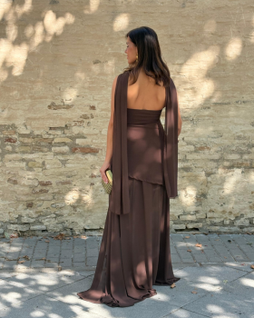34,90 €Vestido largo con cuerpo de corte a la cadera asimétrico. Escote de palabra de honor con detalle de choker a juego. Falda de vuelo de gasa con abertura.