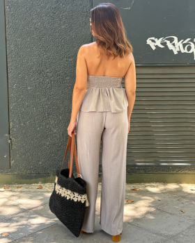 27,99 €Conjunto de dos piezas compuesto por top de palabra de honor con fruncido en el pecho y caída fluida. Tirantes al cuello. Parte de atrás con nido de abeja. Pantalón de tiro alto con nido de abeja en la cintura y pernera ancha.