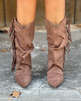 37,90 €Zapato tipo bota de ante. Diseño de media caña con efecto arrugado . Detalle de flecos laterales. Acabado en punta. Tacón bajo.