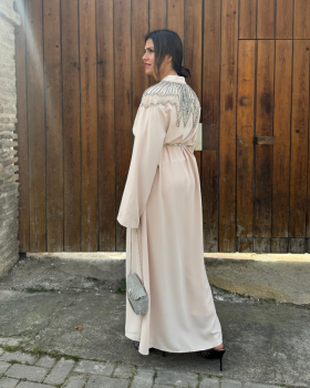 32,50 € / 65,00 €Caftán largo de manga larga un poco acampanada. Cierre frontal con corchete. Detalle de abalorios de piedras en la parte superior haciendo un dibujo.