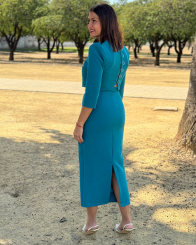 110,00 €Conjunto compuesto por top escote redondo, detalle flor a un lado, espalda abotonada y falda alta recta, abertura trasera.