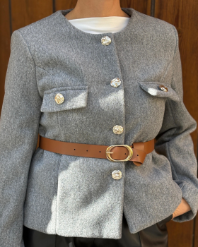 25,99 €Chaqueta corta entallada con cuello redondo y manga larga con hombreras. Simulación de bolsillos frontales con botón. Cierre mediante botones dorados. Incluye cinturón. Forro interior.