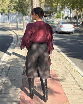 25,99 €Bermuda de cuadro de tiro alto con bolsillos laterales. Cintura con trabilla y cinturón a tono con hebilla dorada. Detalle de costura frontal.