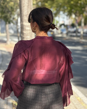 22,99 €Camisa de gasa con cuello en pico y manga larga. Detalle de volantes en el pecho y magas. Cierre frontal con botones.
