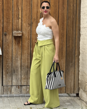 47,90 €Pantalón de tiro alto con vuelta en la cintura. Pinzas delanteras. Bolsillos laterales y simulación de trasero con detalle de botón. Cierre frontal mediante cremallera, gancho y botón.