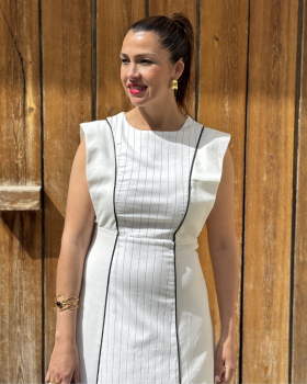 42,99 €Vestido midi de cuello redondo y manga a la sisa con solapas. Cuerpo estructurado con finos plisados y detalle de líneas verticales. Falda con suave volumen. Cierre trasero mediante cremallera.