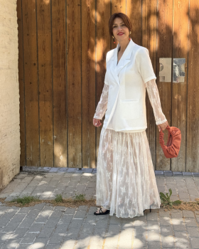 49,99 €Conjunto de dos piezas compuesto por blazer cruzada con cuello solapa y manga corta con hombreras. Detalle de terminación de manga en encaje. Falda mini con terminación mido en encaje. Cintura elástica en la parte trasera. Cierre mediante cremallera latera.