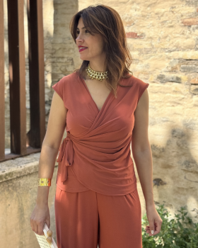 31,99 €Conjunto de dos piezas compuesto por top de cuello halter. Detalle de volate en cascada lateral. Cierre mediante un botón trasero. Pantalón de tiro y pernera ancha. Bolsillos laterales. Cierre mediante botón y cremallera.