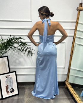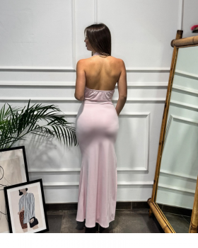 Vestido largo de punto licra con cuello halter atado con lazo al cuello. Tiene detalle de fruncido en el pecho. Fada con abertura y fruncido lateral.