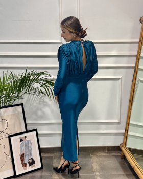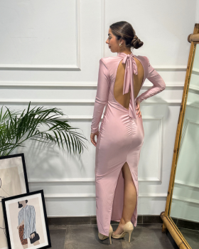 Vestido de corte midi largo en tejjido de punto licra. Cuello subido y manga larga. Detalle de drapeado en la parte frontal. Gran escote de espalda con cierre en lazada. Falda recta con abertura trasera.