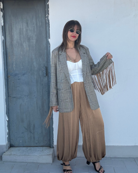 Blazer oversize con cuello solapa y manga larga con hombreras. Detalle de flecos de ante de manga a manga. Cierre mediante un botón.