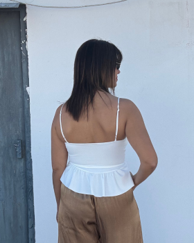 Top tipo corset con tirantas finas regulables. Casco incorporado. Simulación de ballenas en la parte delantera.