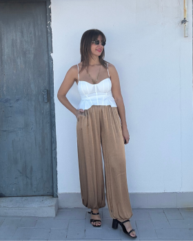 Pantalón de tiro alto confeccionado en tejido satinado. Cinturilla elástica con cordón ajustable. Bolsillo laterales. Bajo abullonado acabado en puño.