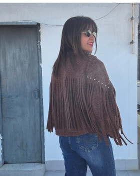 Abrigo corto oversize en tejido de lana de manga larga y cuello solapa con tachas. Detalle de flecos de manga a manga y en la parte frontal del mismo tejido. Cierre frontal con un botón.