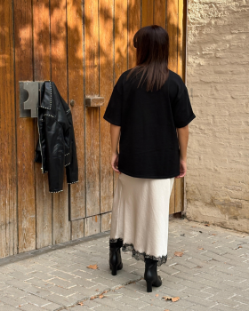 La modelo lleva talla S y tiene talla 36-38 y mide 1,65cm