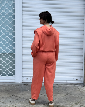Conjunto compuesto por sudadera de cuello redondo con capucha y manga larga. Pantalón balloon de tiro alto con cintura elástica y cordón ajustable. Bolsillos laterales. Detalle de costura frontal.