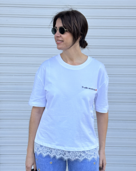 Camiseta de cuello redondo y manga corta. Bajo acabado con encaje. Detalle de bordado frontal.