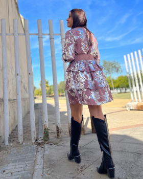 15,00 € / 43,90 €Vestido corto de cuello redondo y manga larga. Detalle de metalizado en forma de manchas. Elástico en la cintura. Falda con tres volantes. Cierre trasero con botón.