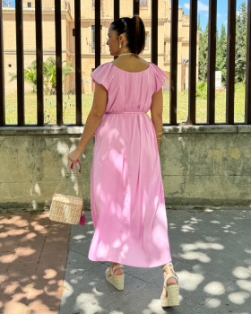 22,45 € / 44,90 €Vestido largo de cuello redondo y manga corta un poco abullonadas. Detalle de pinzas en el hombro y pecho. Cinturón de cuerda. Forro interior