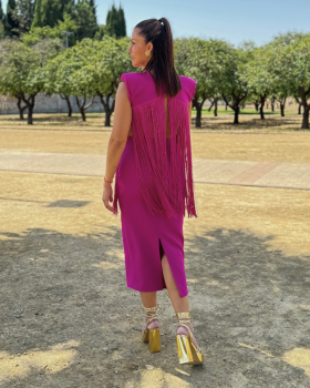 47,50 € / 95,00 €Vestido midi con cuello redondo. Manga a la sisa con hombreras. Franja de flecos en pecho y espalda. Escote de espalda. Cierre trasero mediante cremallera y botones al cuello.