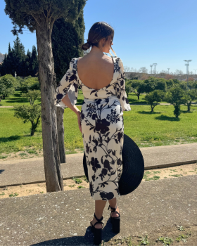 59,50 € / 85,00 €Vestido de corte midi, cuello redondo y manga francesa. Detalle de volantes al hombro con cita a contraste en la terminación. Falda recta con abertura trasera y cierre con cremallera invisible. Gran escote en la espalda con cierre con botones negros. Forro interior