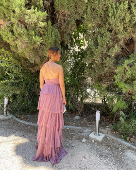 45,00 € / 89,99 €Vestido largo de tirantas con escote en pico. Falda de volantes y detalle de cinturón en la cintura. Las tirantas por la espalda se cruza. Cierre con cremallera trasera. Brillo en el tejido de la tela