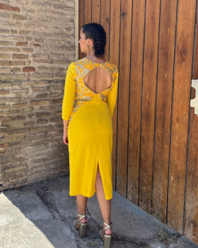 30,00 € / 90,00 €Vestido de corte midi. Media manga con detalle de hombreras y corte a la cintura de flores doradas. Cierre mediante botón al cuello haciendo escote en la espalda y cierre con cremallera invisible. Abertura trasera.