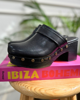 Zapato tipo zueco con detalle de tachas. Suela efecto madera en color negro. Acabado en punta redonda.
