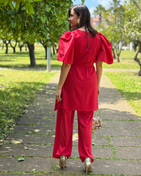39,95 € / 79,90 €Conjunto compuesto por casaca con mangas abullonadas de tafetán. Cierre trasero con botón. Detalle de cinturón a tono. Pantalón de tiro alto con cremallera trasera.