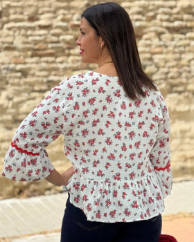 12,45 € / 24,90 €Blusa en tejido de muselina de media manga acaba en volante con detalle de ribete rojo. Cierre frontal con lazadas a contrate de color rojo.