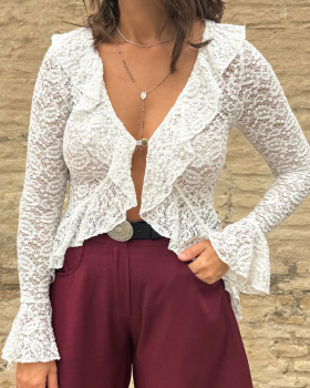 14,95 € / 29,90 €Blusa en tejido de encaje con cuello subido y manga larga transparentes con terminación en puño de volante con cierre de botón dorado. Detalle de vmini volantes en la parte del pecho. Cierre trasero con botón.
