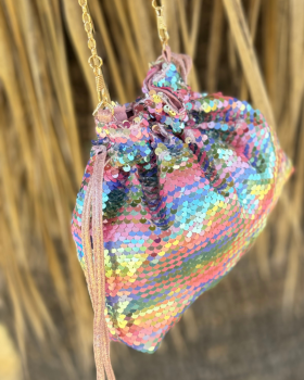 19,90 €Bolso tipo limosnera con lentejuelas de colores. Incluye cadena dorada para colgar.