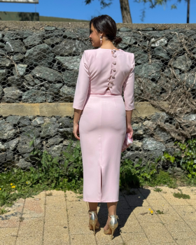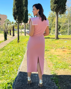 25,90 €Vestido midi en tejido crespón con cuello redondo y manga larga con detalle de tapetas al hombro. Falda recta con abertura trasera y cierre con cremallera. Gran escote de espalda.