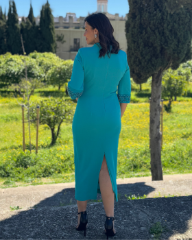 175,00 €Vestido de corte mido con cuello mao y manga francesa con detalles de piedras a tono. Detalle de nudo en la cintura. Cierre trasero con cremallera invisible. Forro interior