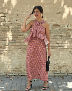 34,90 €Conjunto compuesto por top con escote cruzado con tirantas anchas y terminación en volantes asimétricos. Falda alta con cinturilla elástica.