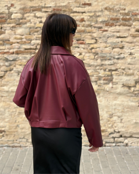 Chaqueta bomber de polipiel de cuello solapa y manga larga. Cierre frontal con cremallera metálica. Bajo acabado con pinzas. Forro interior.