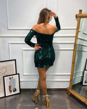 Vestido mini de lentejuelas con escote bardot y manga larga. Forro interior